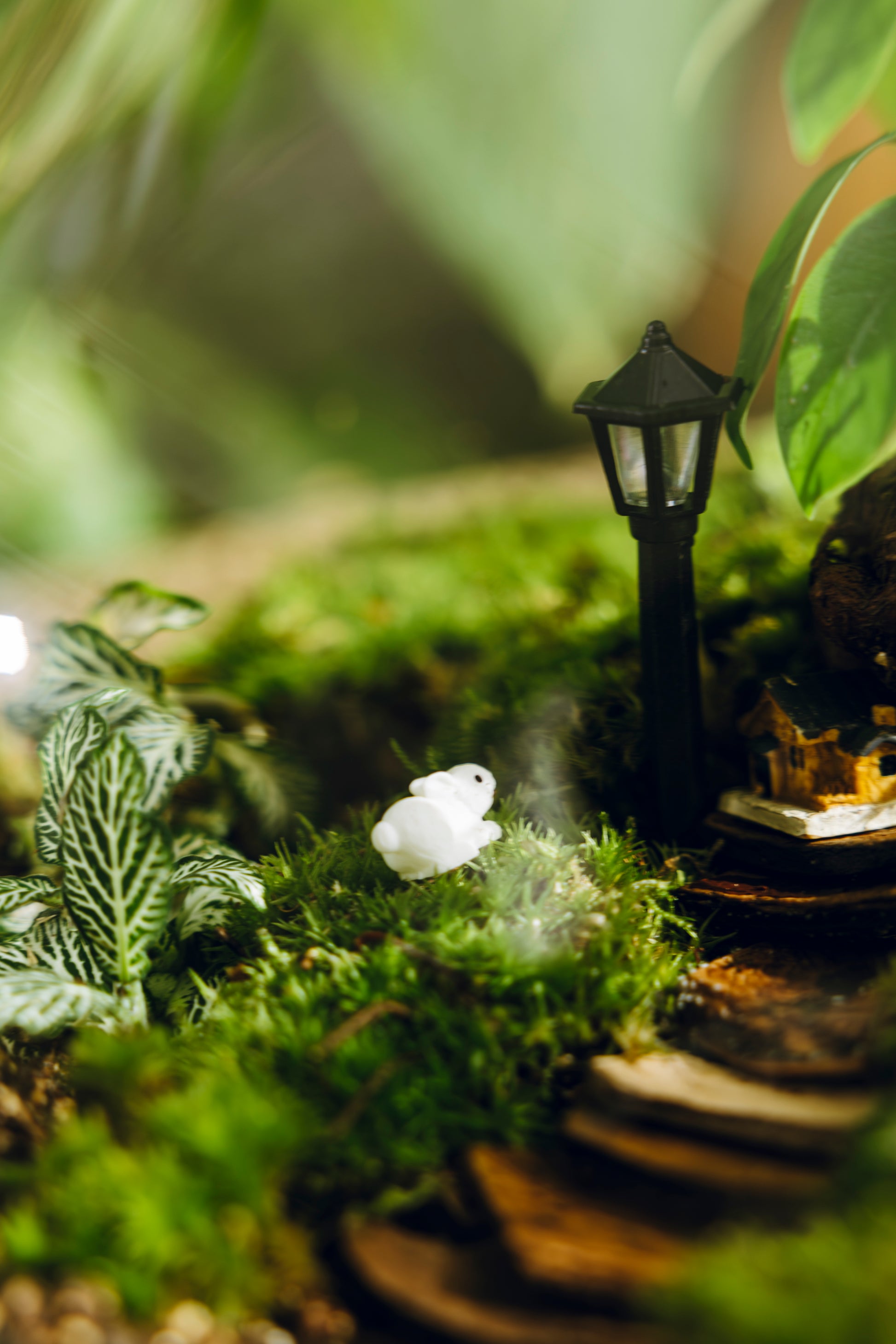 Este terrario está inspirado en la calma de un pequeño jardín urbano. Su diseño recrea un rincón lleno de vida, con gradas de piedra, una lámpara que ilumina suavemente el paisaje y un conejito que descansa entre las plantas tropicales. Jardín El Prat evoca la sensación de pasear por un parque tranquilo al atardecer, donde cada detalle invita a detenerse, respirar y disfrutar de la belleza de lo simple.