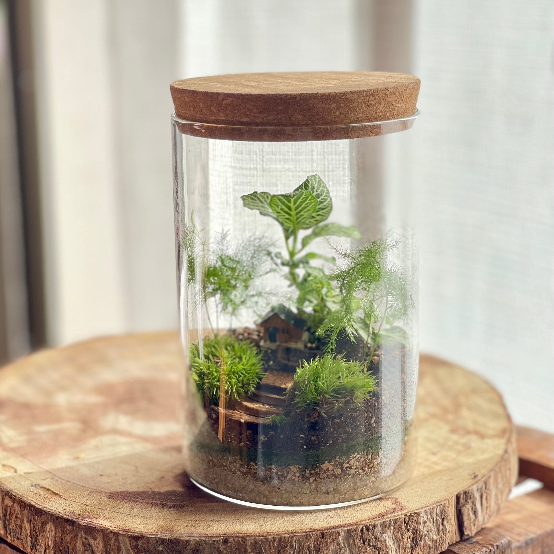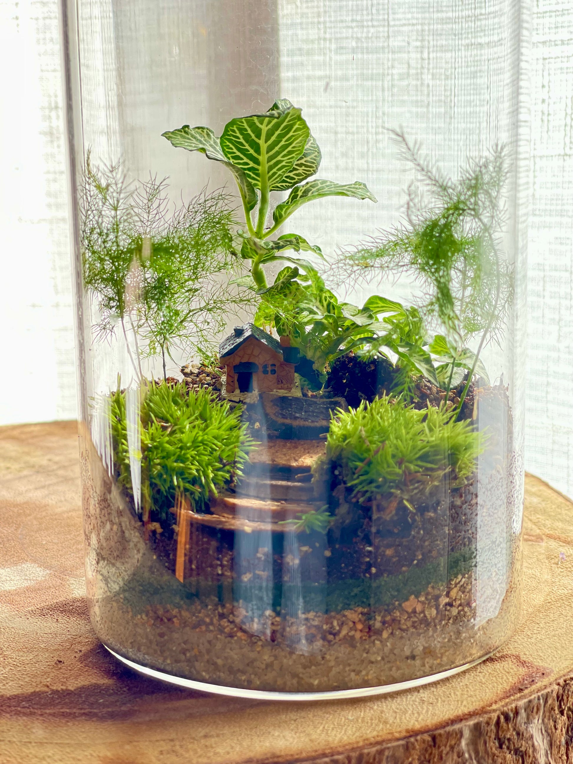 El Jardín Besalú está inspirado en la magia y el encanto del pueblo medieval de Besalú, en Catalunya, donde cada rincón respira historia y serenidad. Dentro del cristal, un pequeño paisaje con casita, escaleras y plantas crea un mundo en miniatura que evoca calma y equilibrio. Cada detalle refleja la armonía entre arquitectura, naturaleza y vida, invitando a detenerse, contemplar y reconectar con la belleza de los pequeños mundos que podemos crear.