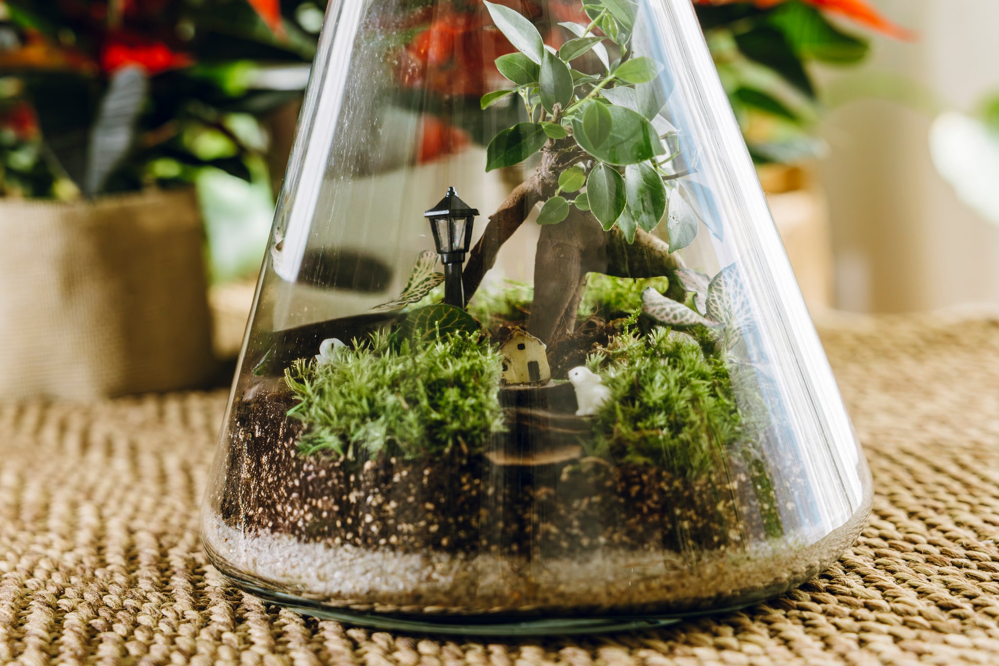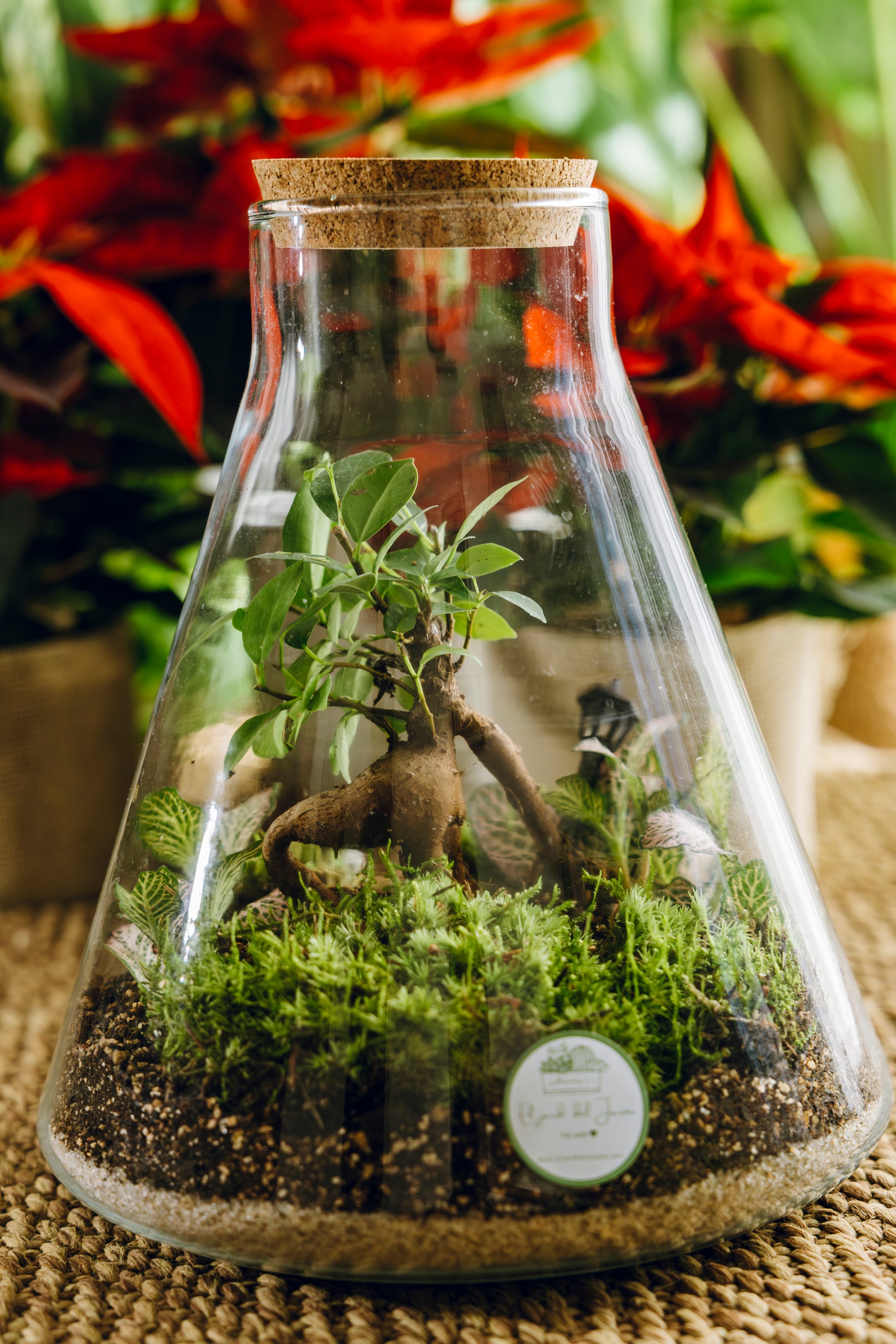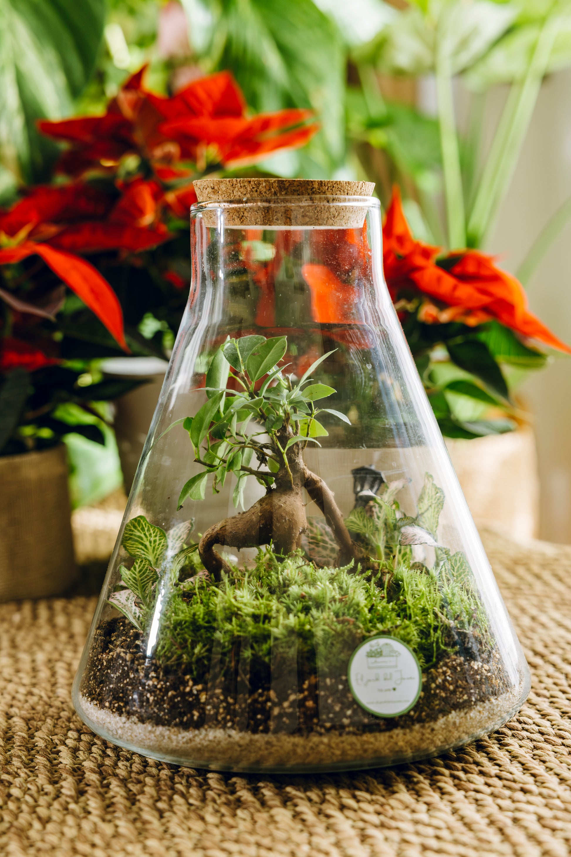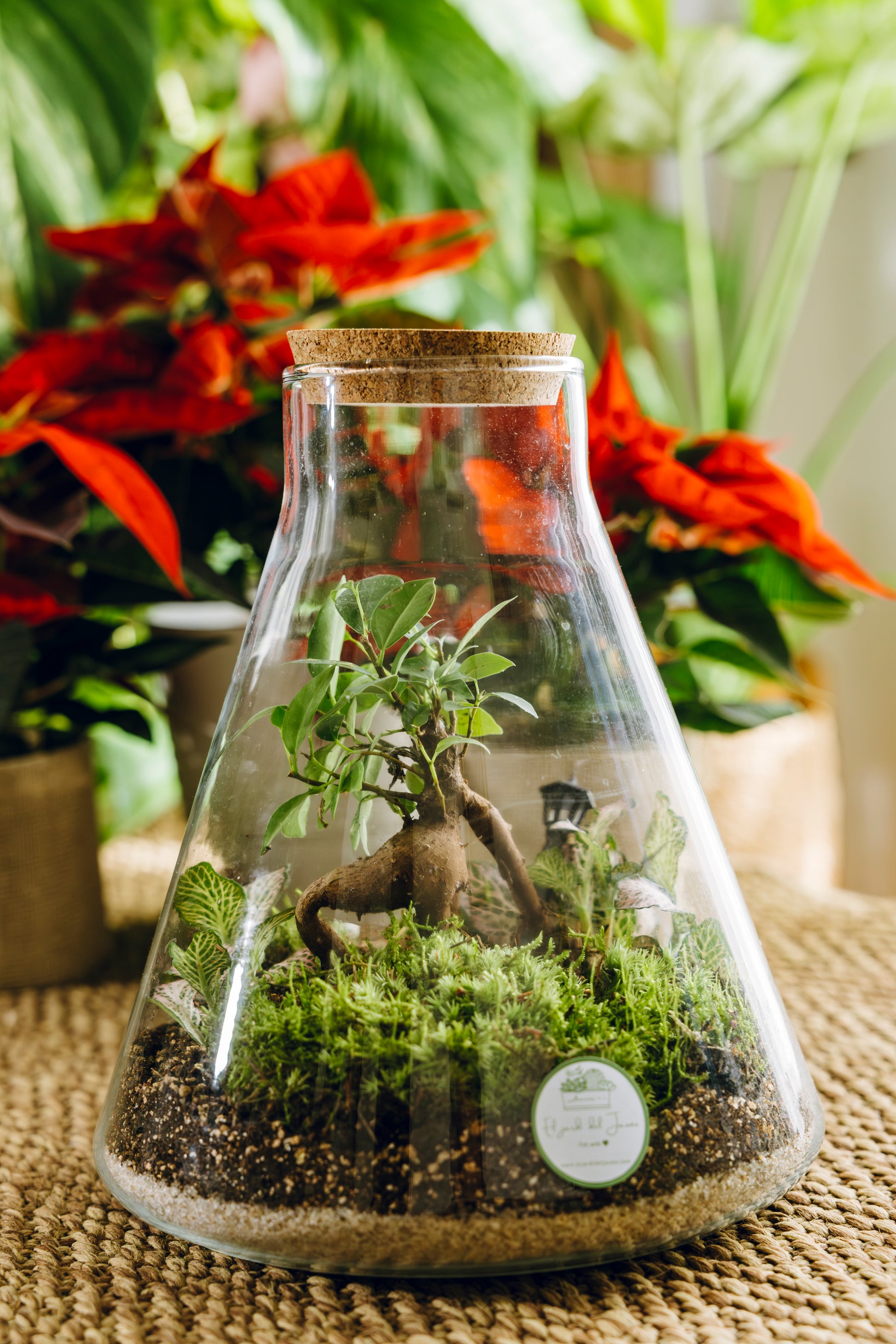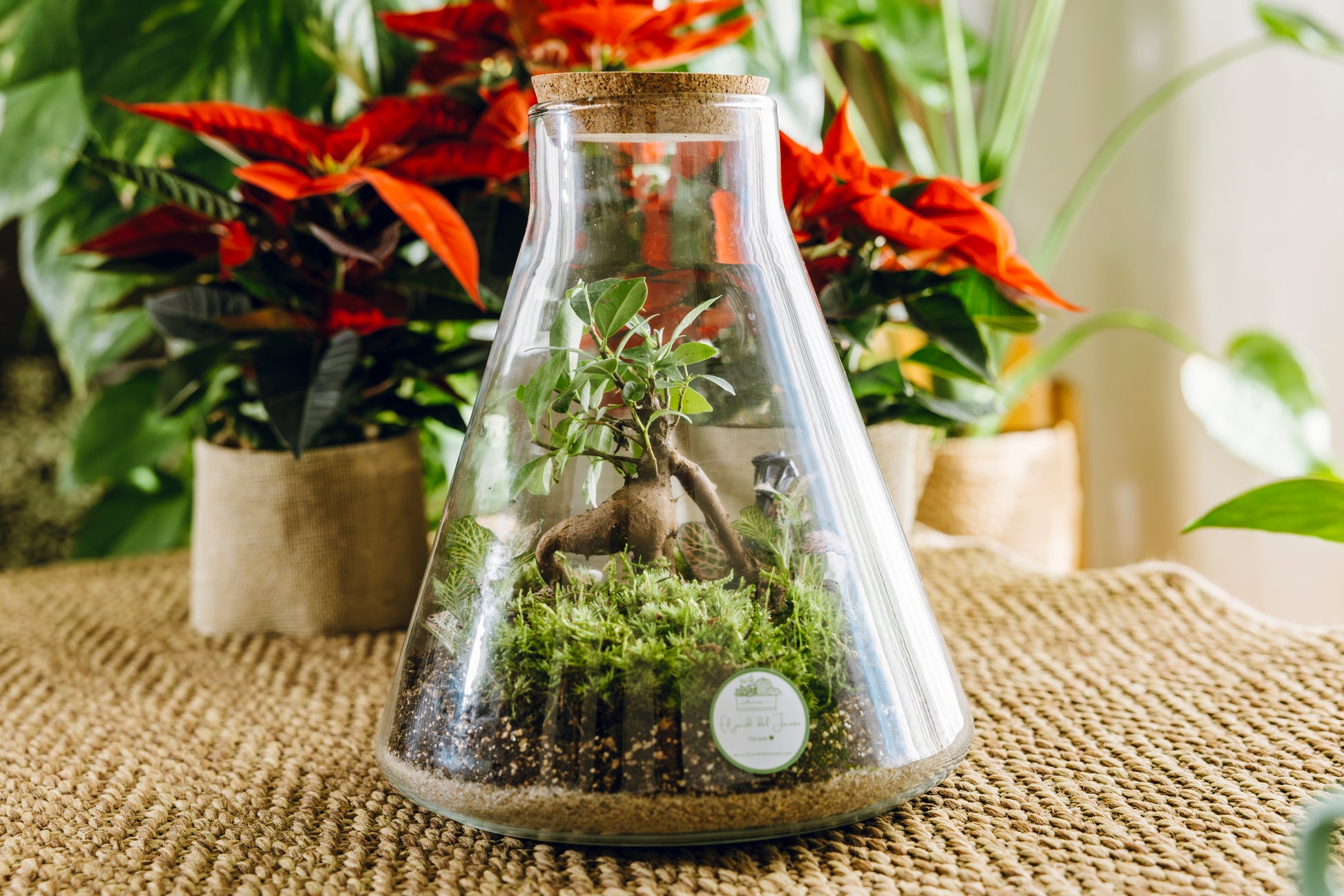 Plantas incluidas: Ficus Ginseng (tamaño s), Peperonia Caperata, Hedera helix bebe y musgo.