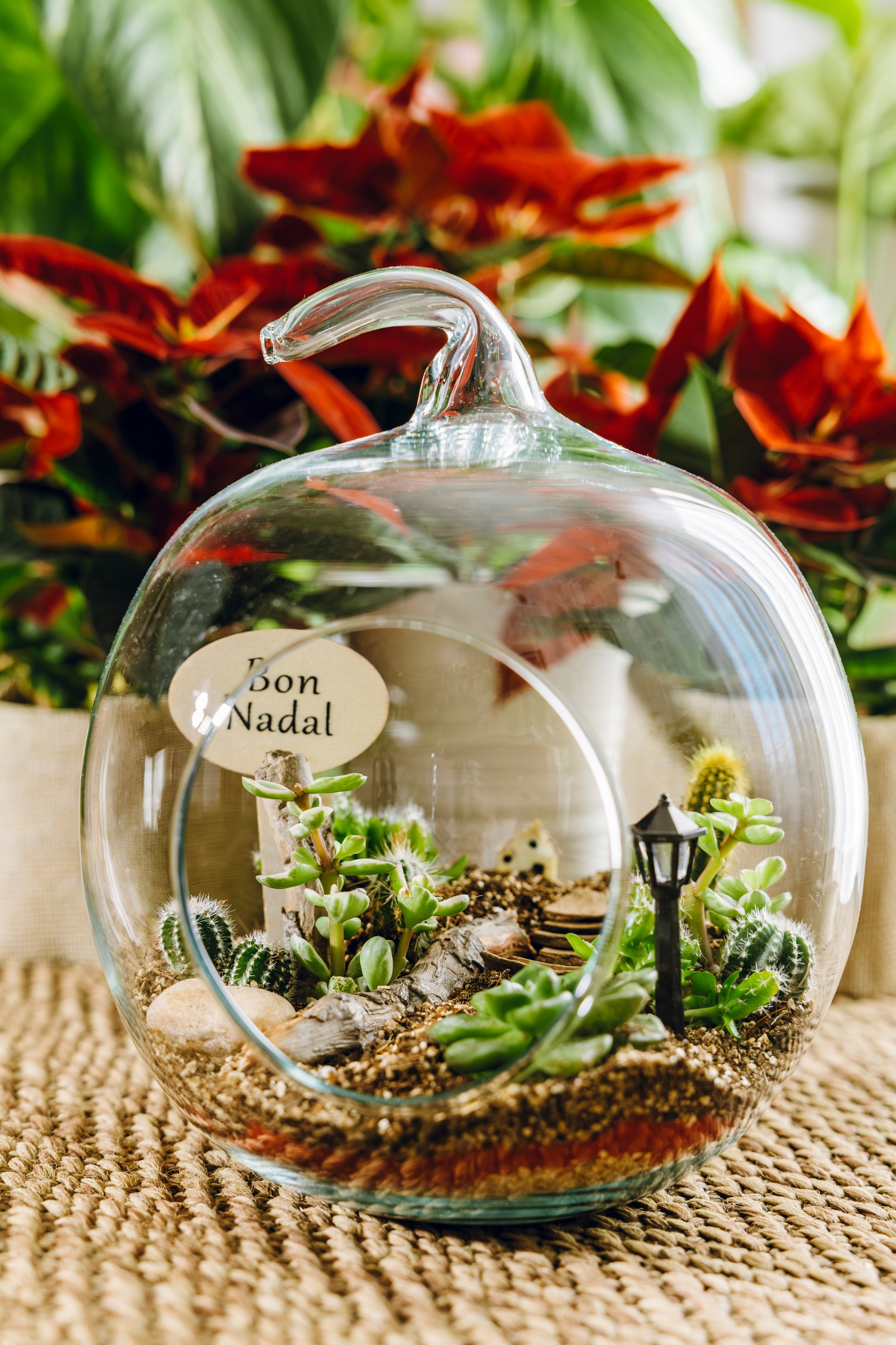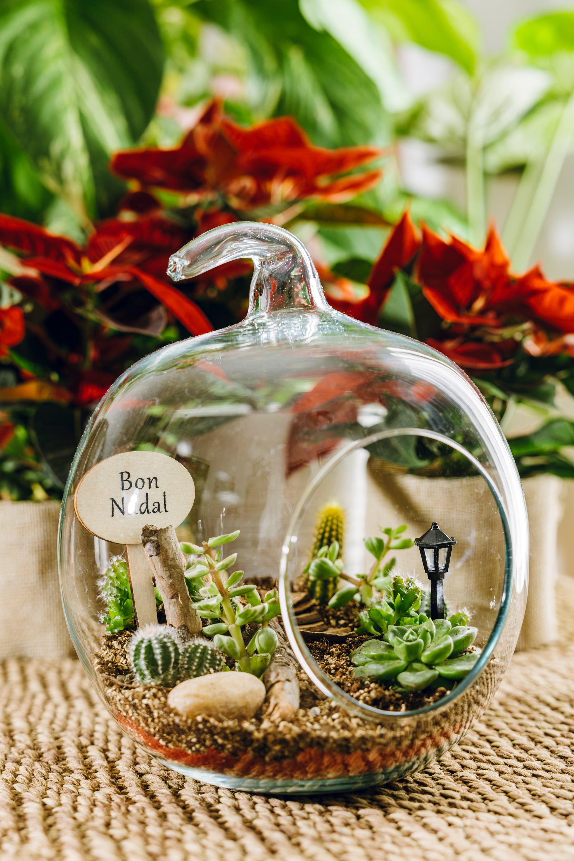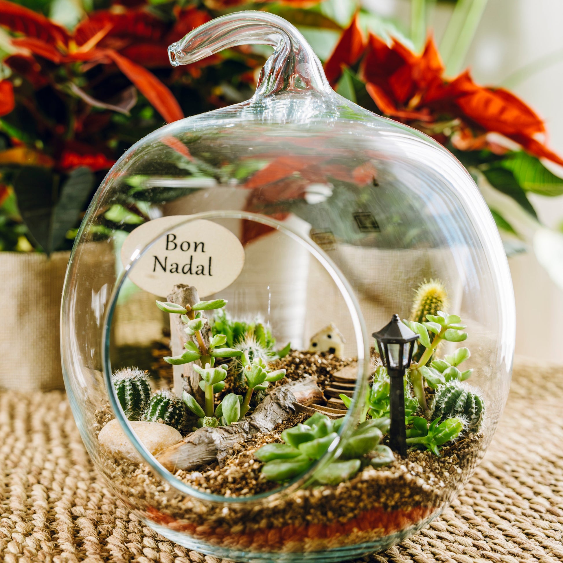 La versión navideña de nuestro clásico Jardín Poma está inspirada en la calidez de las fiestas y en los momentos compartidos en casa. Dentro del cristal, las plantas desérticas conviven con un delicado paisaje decorado con piedras naturales y una mini casita que aporta un aire encantador y nostálgico.